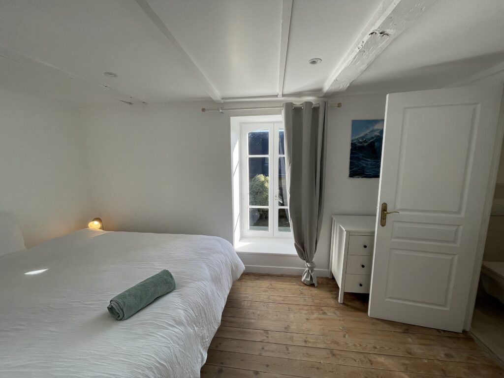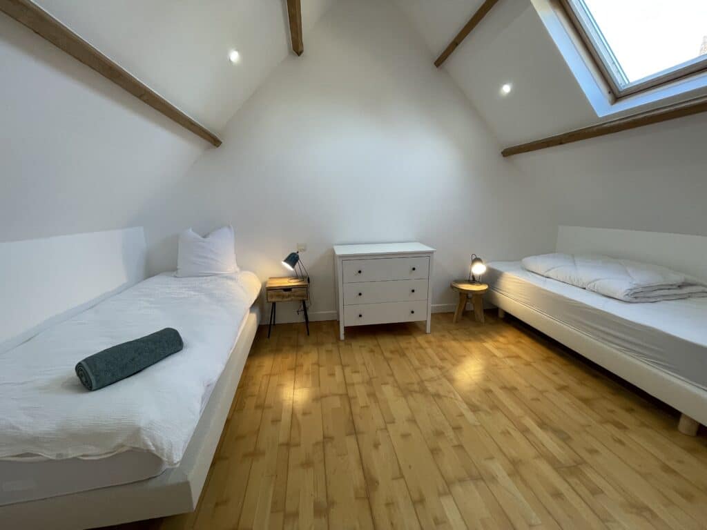 chambre de la maison de vacances et de séminaire La Maison Rosporden. Les lits sont faits à l'arrivée.